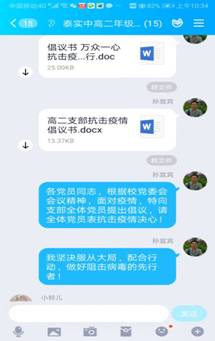會后,各個支部立即響應(yīng),向支部全體黨員發(fā)出的倡議。倡議全體黨員:要提高政治站位,自覺擔當;要盡責履職,自覺正面引領(lǐng);要主動作為,精心備課上課,確保學生停課不停學。用實際行動展現(xiàn)共產(chǎn)黨員的精神風范。全校黨員通過微信接力積極承諾,表示要以科學的態(tài)度認識疫情、應(yīng)對疫情,在疫情面前主動擔當作為,盡職盡責,從自身做起,自覺踐行防控要求,發(fā)揮帶頭作用!